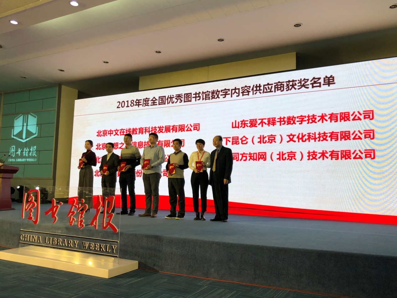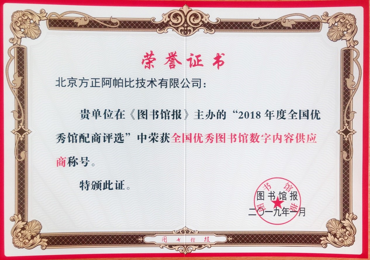論壇期間進行了全國優(yōu)秀館配商頒獎典禮,這是館配行業(yè)共建共享的權威評選活動,也是業(yè)內公認的評價館配企業(yè)的重要參考指標。在2018全國優(yōu)秀館配商評選活動中,北京方正阿帕比技術有限公司脫穎而出,獲得“2018全國優(yōu)秀圖書館數字內容供應商”殊榮。