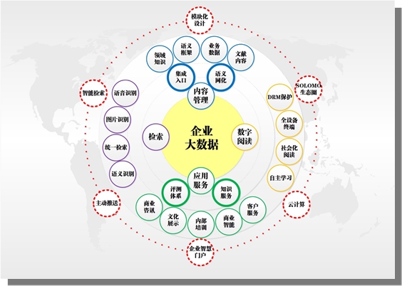 方正阿帕比提出的智慧企業(yè)概念是一種圍繞企業(yè)大數(shù)據(jù)進行的知識管理與服務(wù)的解決方案,它打破了傳統(tǒng)互聯(lián)網(wǎng)以信息形式管理文獻的方式方法,而是圍繞企業(yè)業(yè)務(wù)和培訓(xùn)需要,進行企業(yè)知識的內(nèi)容管理、知識檢索、閱讀與其它智能化的應(yīng)用服務(wù),該解決方案全程對內(nèi)容進行語義化,從而使企業(yè)完成從信息化到智能化的升級轉(zhuǎn)變。