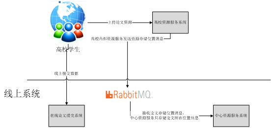 為了提高對(duì)高校使用論文提交系統(tǒng)的支持及快速響應(yīng),論文提交系統(tǒng)在線部署,高校對(duì)論文的提交、學(xué)校信息、學(xué)生信息等的管理使用線上服務(wù),可以做到有問(wèn)題及時(shí)響應(yīng)。同時(shí)為了滿足高校對(duì)論文安全性的要求,本系統(tǒng)中將資源存儲(chǔ)從線上服務(wù)獨(dú)立出來(lái)形成了資源服務(wù)系統(tǒng),部署在高校。學(xué)生上傳的論文資源直接存儲(chǔ)在高校部署的資源服務(wù)系統(tǒng)中,從而達(dá)到在線提供優(yōu)質(zhì)服務(wù),線下提供資源管理服務(wù)提升論文安全性。
